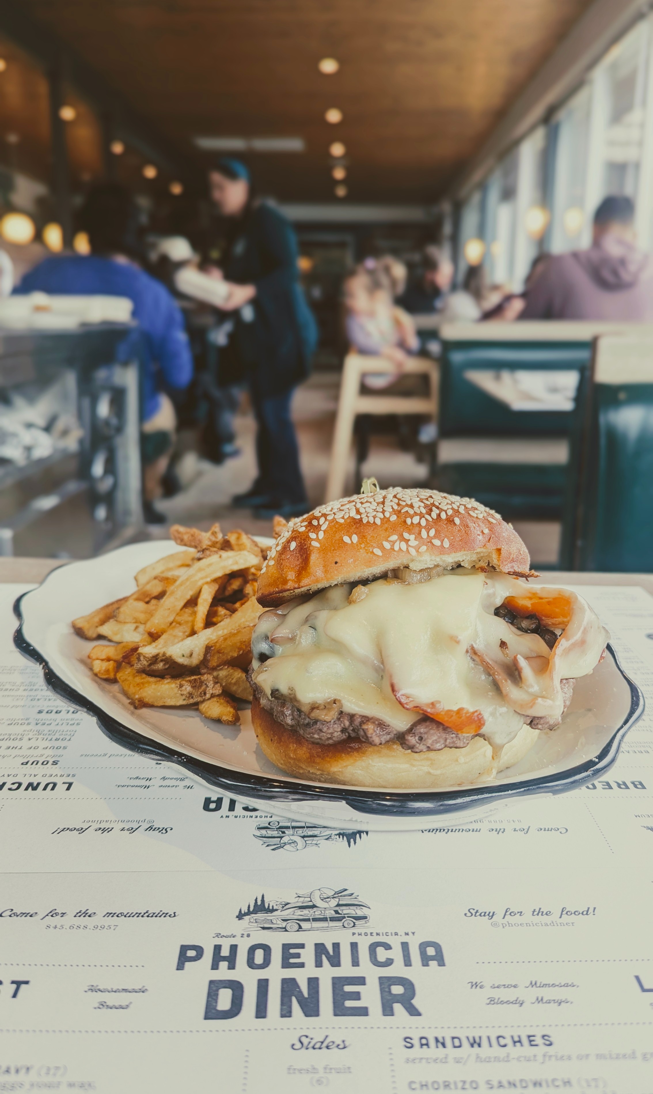 bacon, seeded potato bun, fries or greens
