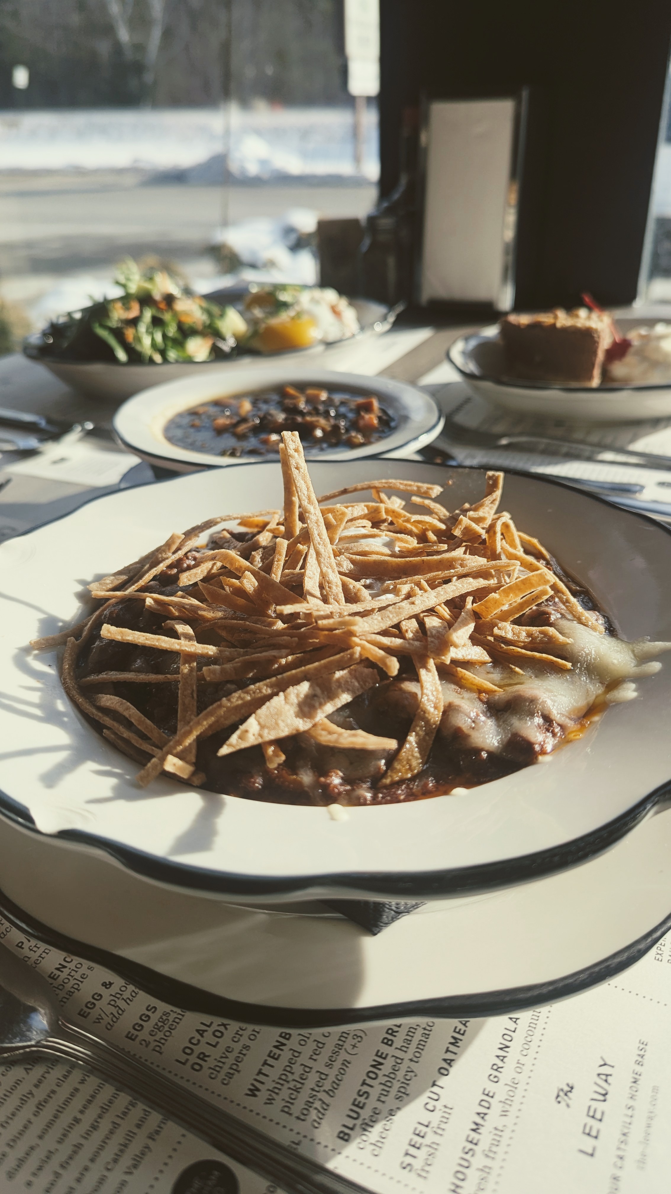 Veritas beef, kidney beans, sour cream, tortilla chips, white cheddar